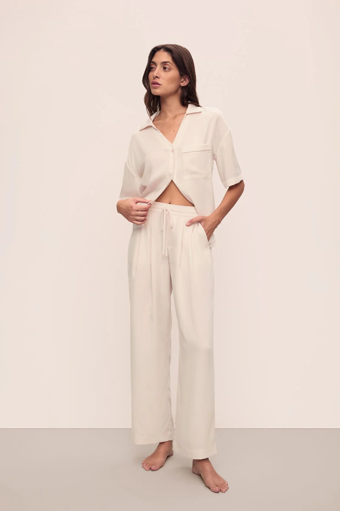 For staying in and heading out. Made from non-stretch TENCEL™ Lyocell, this fabric is verified by OEKO-TEX® Standard 100, which means it was processed without harmful chemicals. Designed with natural Corozo buttons, dropped shoulders, a boxy, cropped silhouette, and delicate ladder lace trim, it’s the perfect blend of timelessness and ease. Pair it with the matching TENCEL™ Woven Relaxed Pant for a comfortable head-to-toe look.